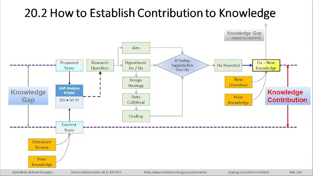 Contribution to Knowledge is explained as follows: You conduct a literature review by reading related, relevant documents. As you read, you extract excerpts that are relevant to your study. As key ideas develop you make a mind map depicting the relationships between the ideas (or items). Excerpts from your literature review are tagged against one or more of these items. Yes, the items and extracts have to be developed interactively. Then, for each item you need to evaluate the gap by consider the PICOS (Population, Intervention, Comparison, Outcome and Setting) or the PITAM (Procedure, Intervention, Theory, Analysis and Methodology) gap evaluation items or indeed you can make your own gap evaluation items. Additionally, you need to mark the item as a DV (Dependent Variable), IV (Independent Variable) or SV (Scope Variable).